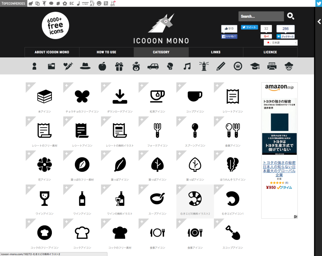 アイコン素材サイトご紹介 eshu 10年前 http://icooon-mono.com/ フラットでモノクロのアイコン集 6000点〜あり、カテゴライズも凝ってます。 ディティールは角R系が多く優しくて親しみやすい感じのアイコン クオリティが高いです。